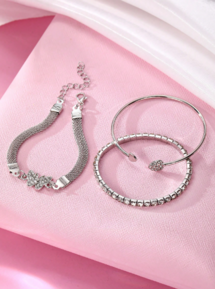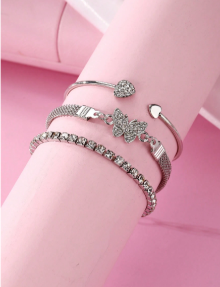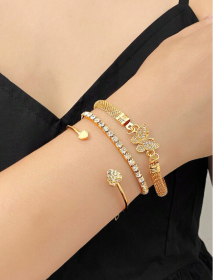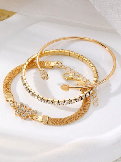 Ensemble de 3 bracelets empilables de luxe simples et personnalisés avec strass, motif papillon et cœur, pour femmes, élégant