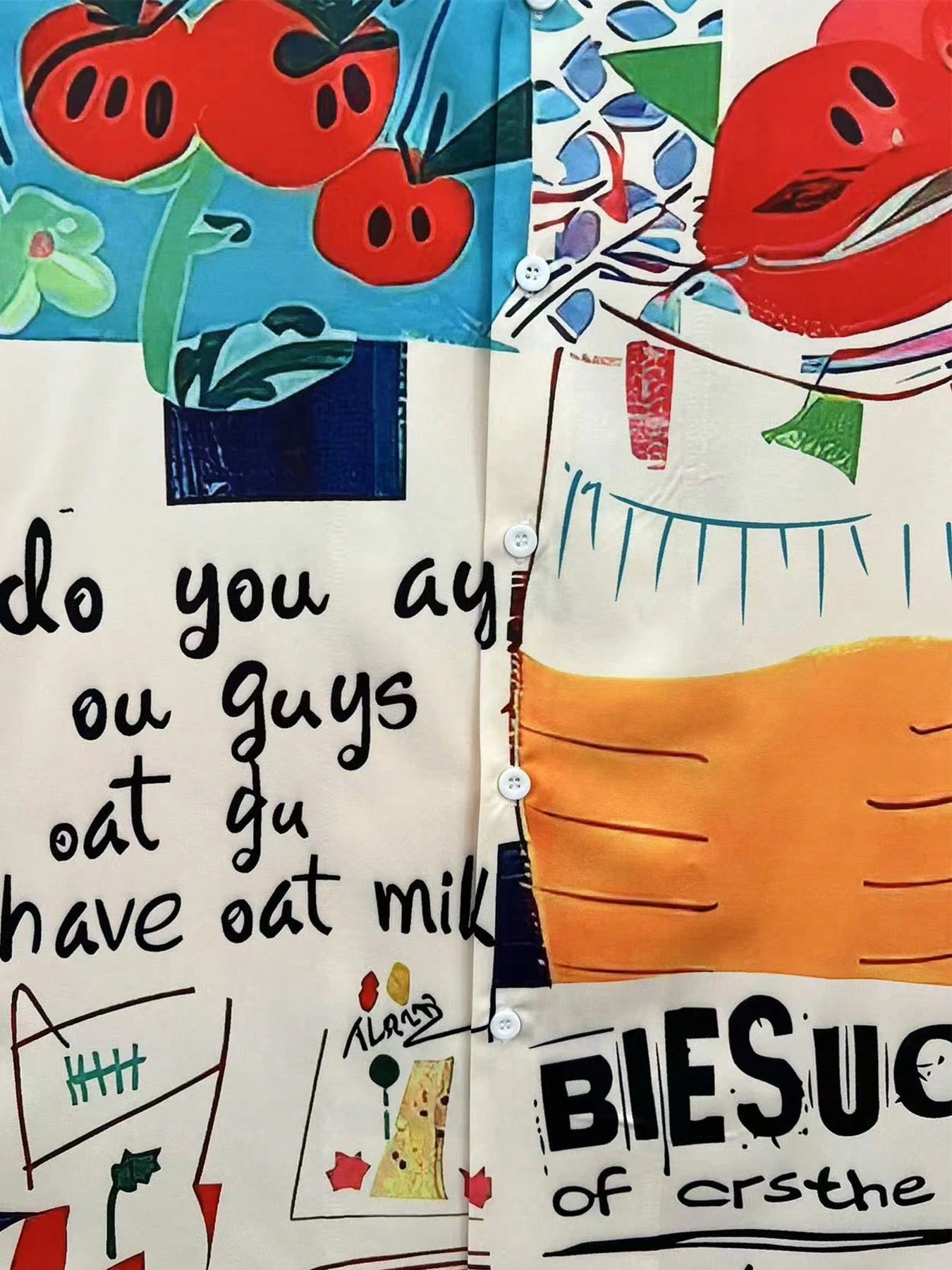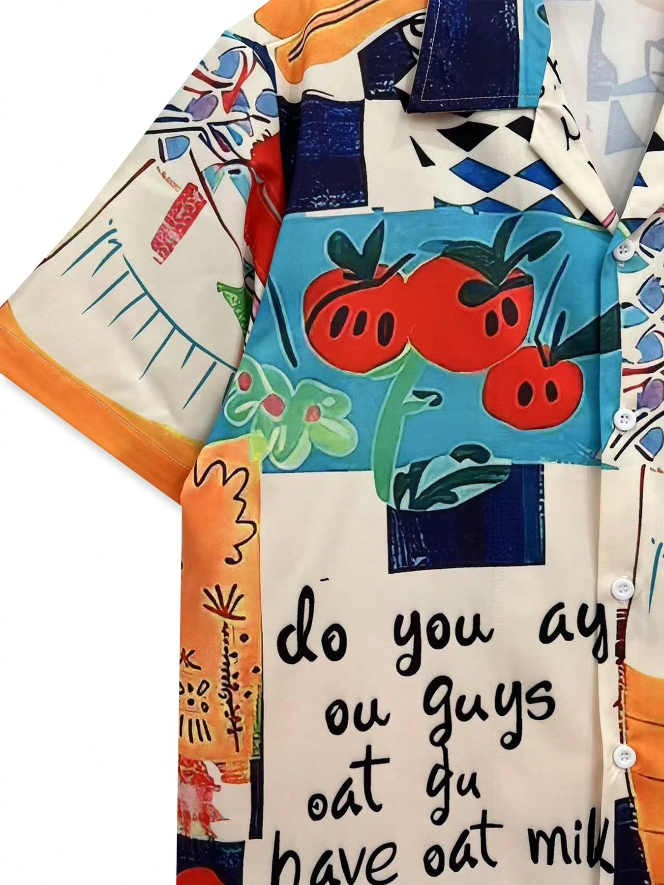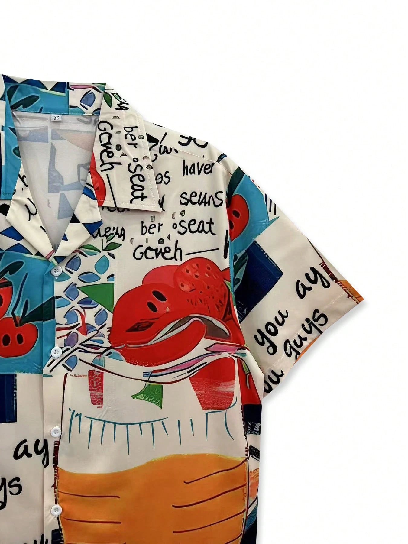 T-shirt imprimé rétro avec motif fruits et lettres, unisexe, idéal pour les vacances d'été