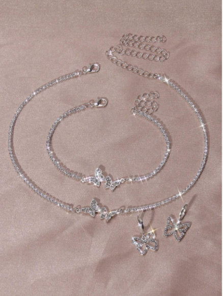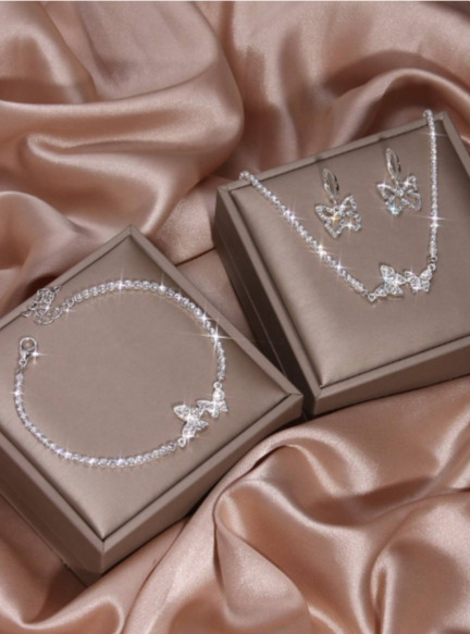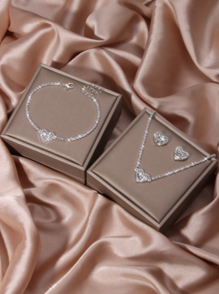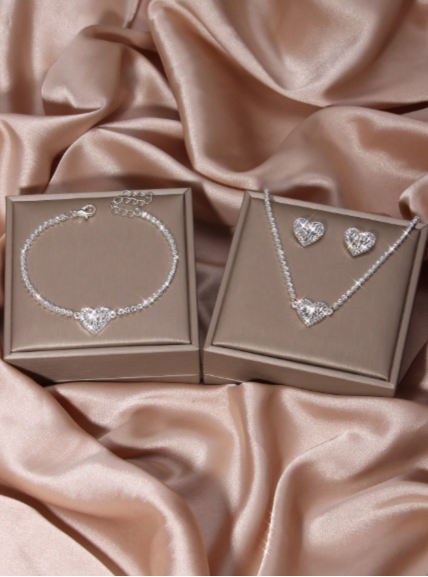 Fashion Full Rhinestone Jewelry Set Earrings, Necklace, Bracelet, Crumpled Heart Pendant, Party/Wedding Gift Accessories For Women