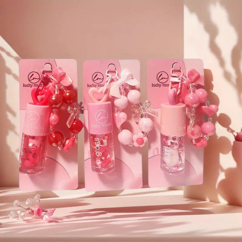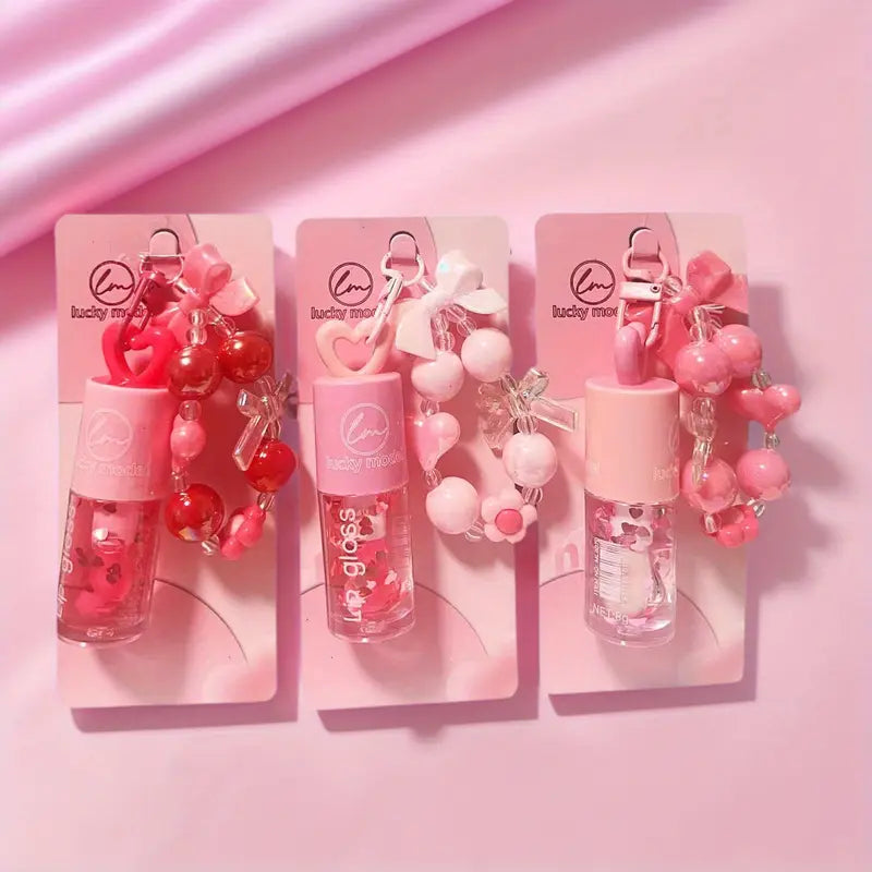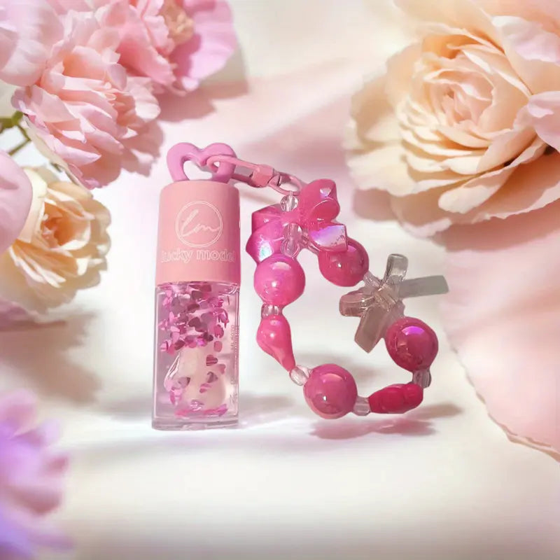 2 en 1, brillo labial hidratante y pulsera con llavero - Vitamina E y ácido hialurónico, sin alcohol, acabado natural para todos los tonos beige claros, serie de cuidado de la piel coreana-japonesa, diseño lindo rosa y blanco, brillo labial para labios secos, accesorio juguetón, elegante empaque.