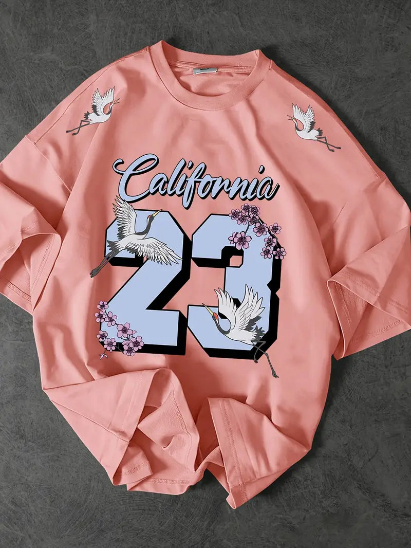 Maillot Graphique Homme Californie avec Cerisiers, Grue et Numéro 23 - T-Shirt Décontracté à Manches Courtes Col Rond, Tissu Doux Respirant, Lavable en Machine pour Tenues Casual et Thème Californien
