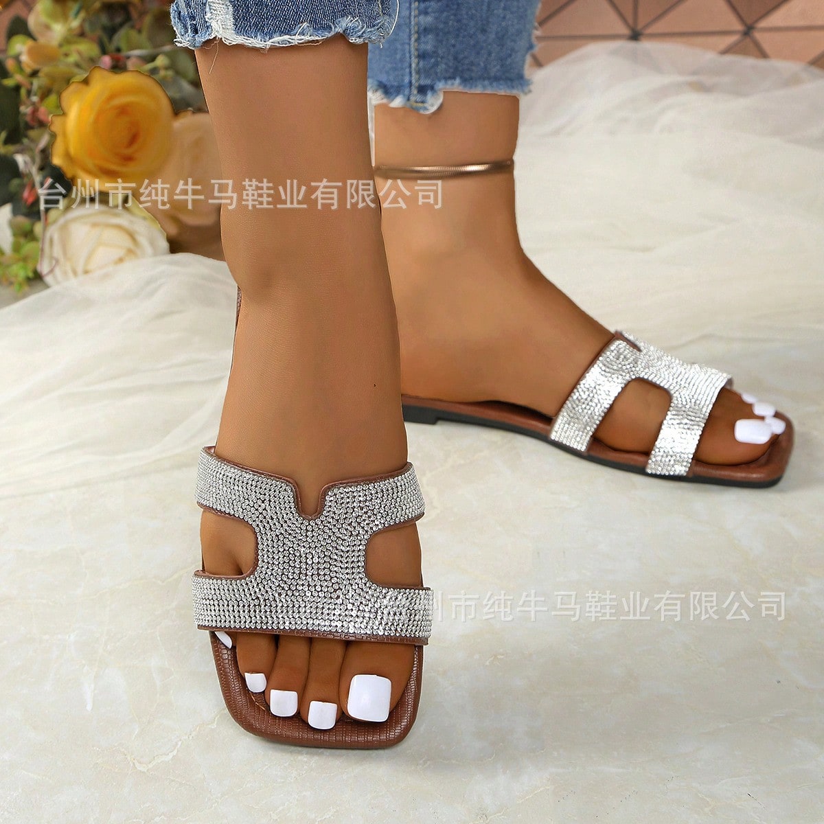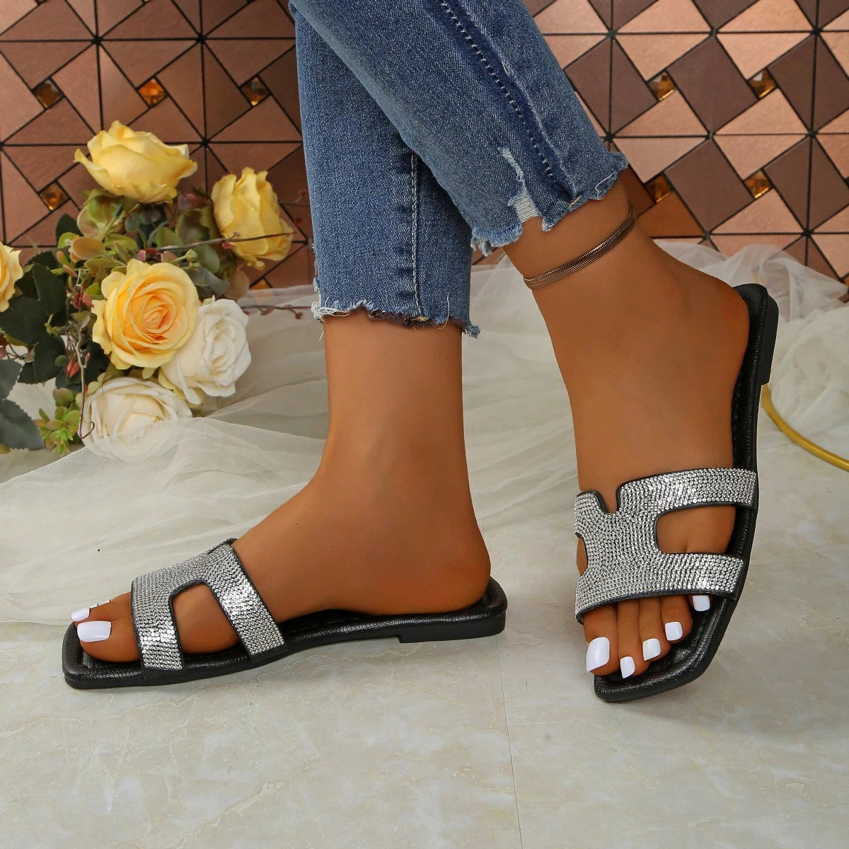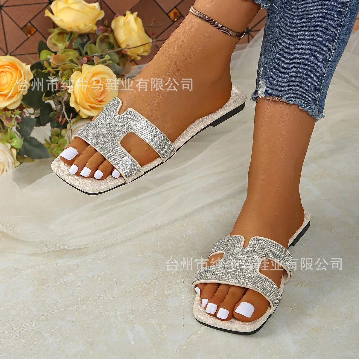 Nouvelles pantoufles originales de haute qualité pour femmes de style H avec décoration en strass, chaussures plates d'été 2024, sandales pour femmes à la mode Jasmine